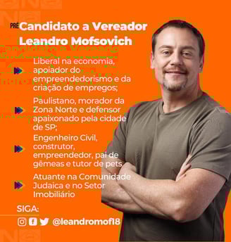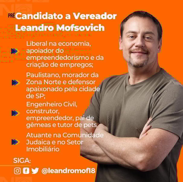 Leandro Mofsovich, engenheiro civil e empreendedor, comprometido com o desenvolvimento econômico e social de São Paulo. Apoie para um futuro melhor!